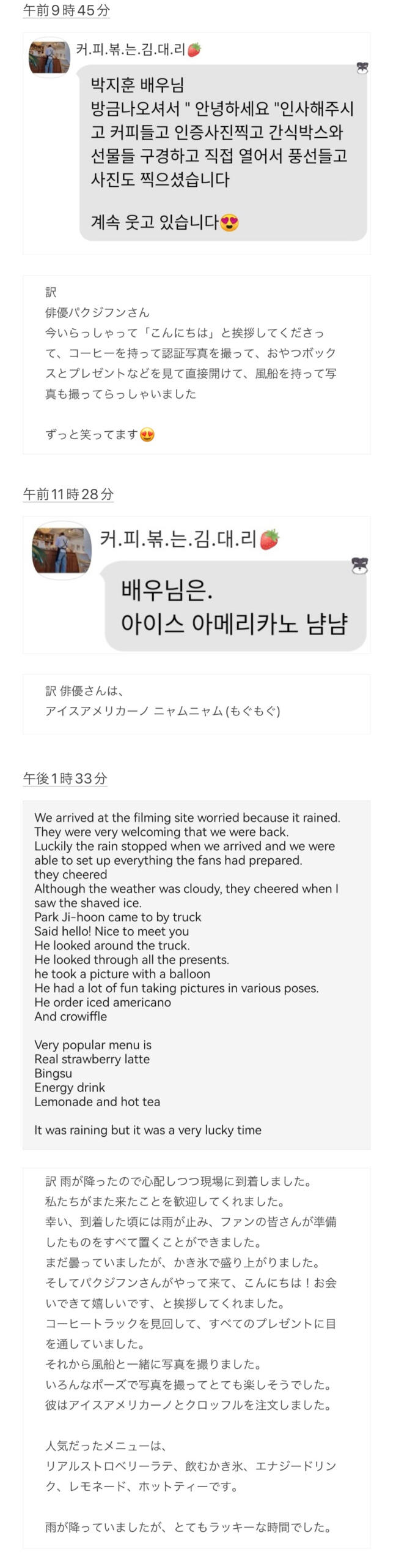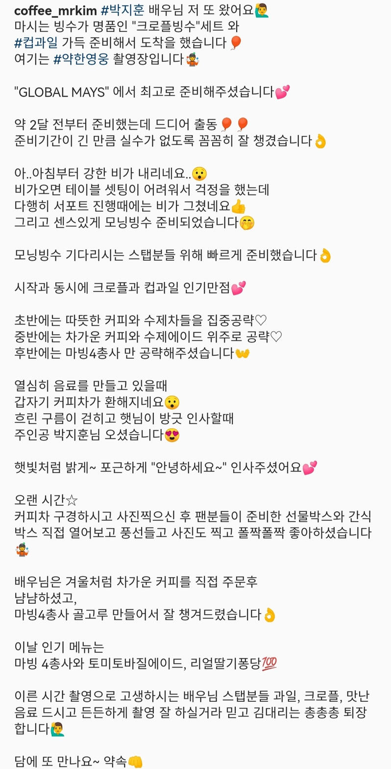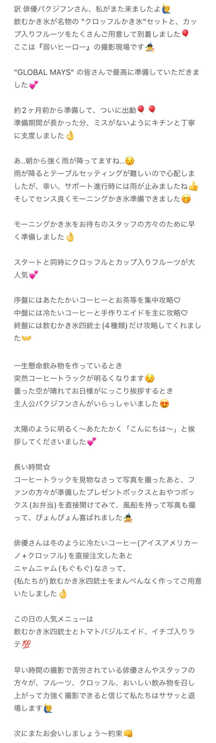 当日、撮影現場の天気予報では降水確率が60%、朝に雨が降り始めたと聞きました。コーヒートラックのお店の方からは、雨で品物がすべては並べられないかもしれない、と連絡がありました。ですが幸い、サポートの時間には雨が止んで晴れてくれたそうで、現場ではあたたかい・冷たい飲み物やスナック類を楽しんでいただけました。当日はたくさんの注文があり、現場のスタッフさんからは飲み物や飲むかき氷が人気だったそうで、コーヒートラックのスタッフさんから注文数が売り切れましたと報告がありました。追加注文しますか?とのことで、ジフンさんと現場の皆さんで好きなだけ楽しんでもらいたいと運営メンバーが追加寄付をしたりしました。その後、サポートが終わり、皆さんとても楽しんでいただけたと聞き、パクジフンさんへのGLOBAL MAYSのドラマサポートは無事に大成功で幕を閉じれたのではないかと思います。13. お礼今回のGLOBAL MAYSのドラマサポートは、運営メンバーも全員海外でとても大変でしたが、いろんな方々のおかげで順調に行うことができました。1.Coffee Mr. Kim(コーヒートラック店)- いつも質問やリクエストに応えていただき、コーヒートラック等を通してGLOBAL MAYSがジフンさんに愛と応援を伝えるために気軽に相談に乗っていただき、そして当日のことを記録して見せてくださいました。2.Sororong (バルーンショップ) - GLOBAL MAYSの愛が詰まったサプライズバルーンをオーダーメイドで作っていただきました。3.所属事務所(Maroo)の皆さん、『弱いヒーロー』制作チームの皆さん - GLOBAL MAYSの今回のドラマサポートの日程調整をしていただき、貴重な機会をくださいました。4.Hoonee_homeさん - 韓国の業者さんとの調整にご協力いただきました。そして最後に、この企画の成功になくてはならないのが、今回のサポート企画のために募金にご参加いただいた GLOBAL MAYの皆さんです。皆さん、本当にありがとうございました!